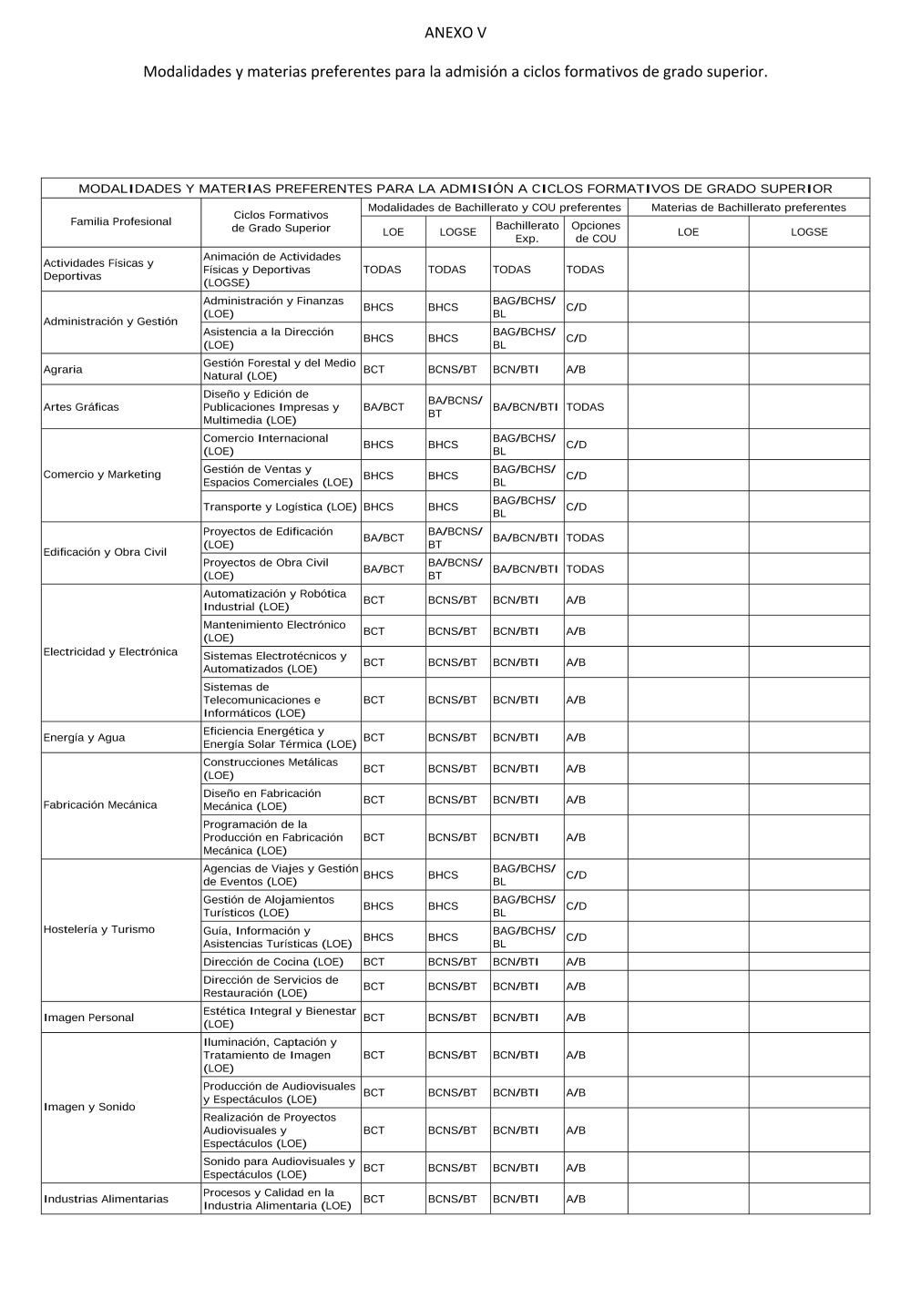 Admisión FP presencial 2016. Anexo V. Modalidades y materias preferentes GS (pdf)