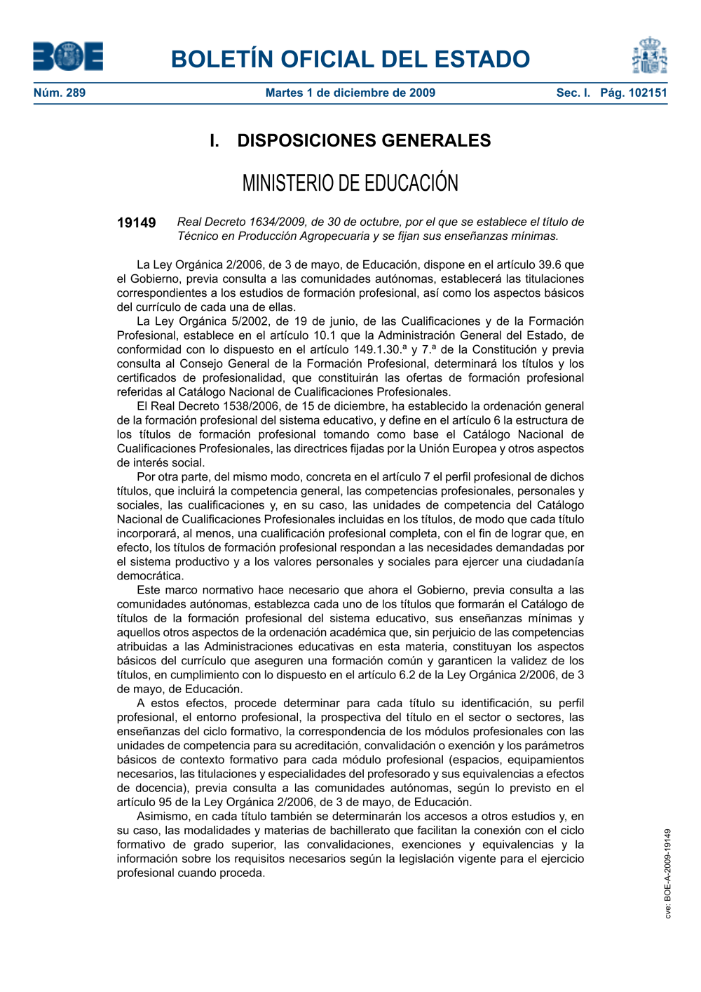DECRETO 1634/2009 de 30/10/2009;MINISTERIO DE EDUCACIÓN;BOE-A-2009-19149;BOE 289 de 2009;19149;01/12/2009