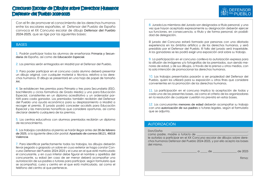 Convocatoria y bases para el Concurso Escolar de Dibujo sobre Derechos Humanos Defensor del Pueblo 2019-2020