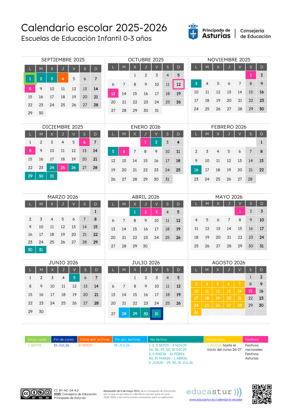 Calendario escolar 2025-2026. E. Infantil 0-3 años