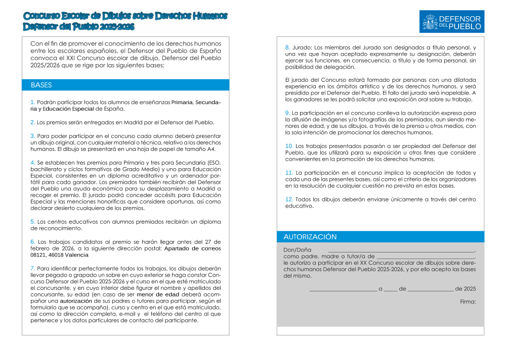 Convocatoria y bases para el Concurso Escolar de Dibujo sobre Derechos Humanos Defensor del Pueblo 2019-2020