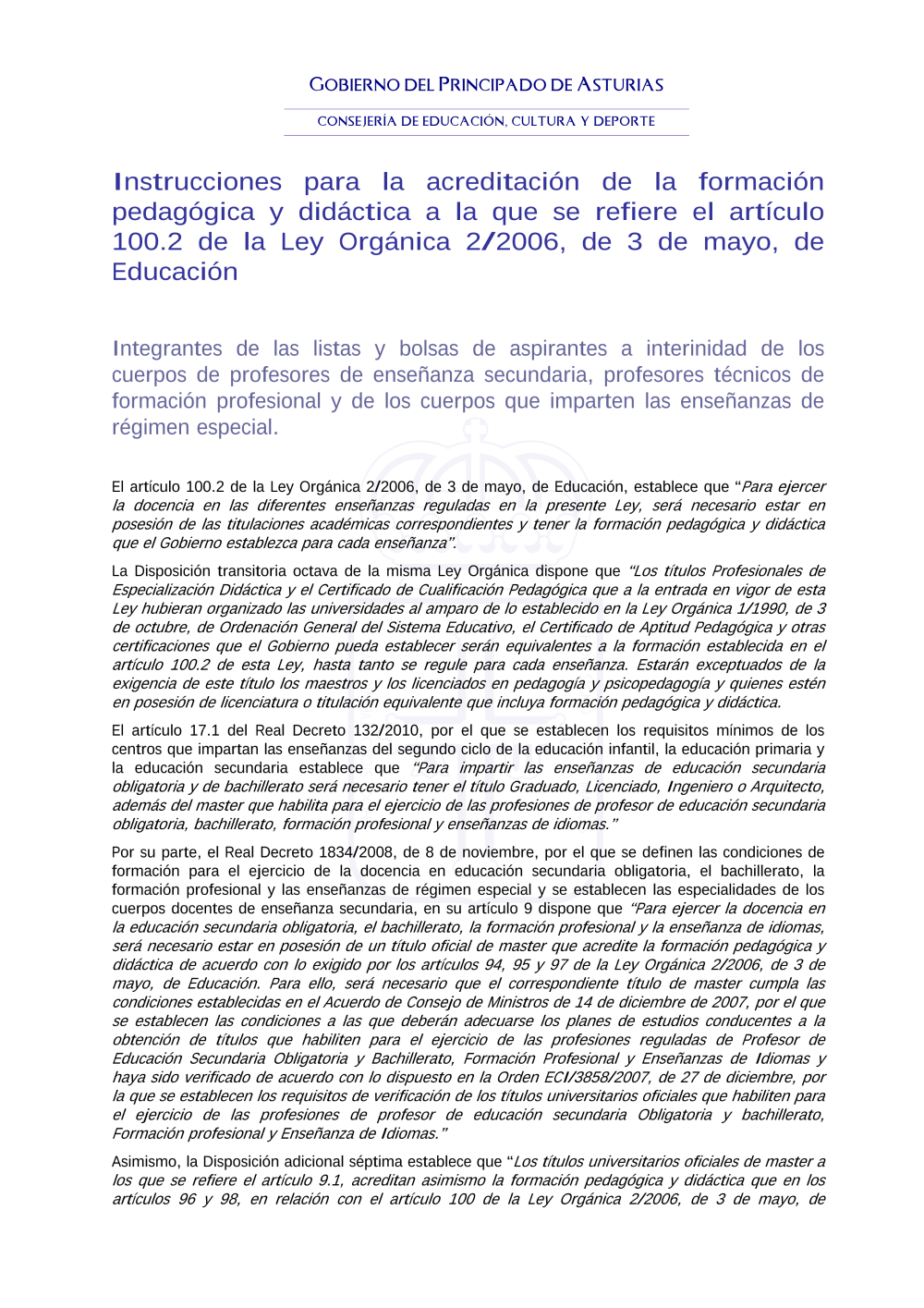 Instrucciones para la acreditación de la formación pedagógica y didáctica a la que se refiere el artículo 100