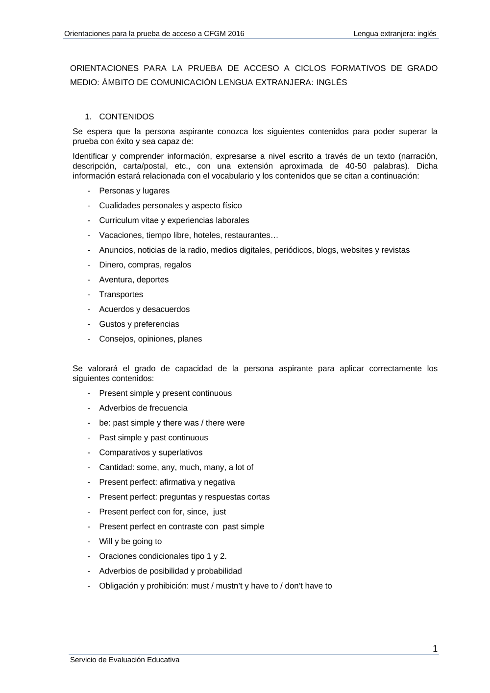 - 2016 Orientaciones prueba acceso ciclos GM. Lengua Extranjera, Inglés (pdf)