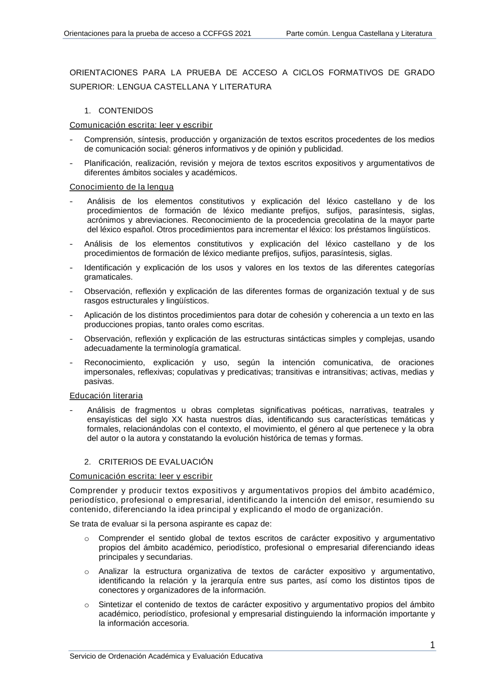 ORIENTACIONES PARA LA PRUEBA DE ACCESO A CICLOS FORMATIVOS DE GRADO SUPERIOR: LENGUA CASTELLANA Y LITERATURA