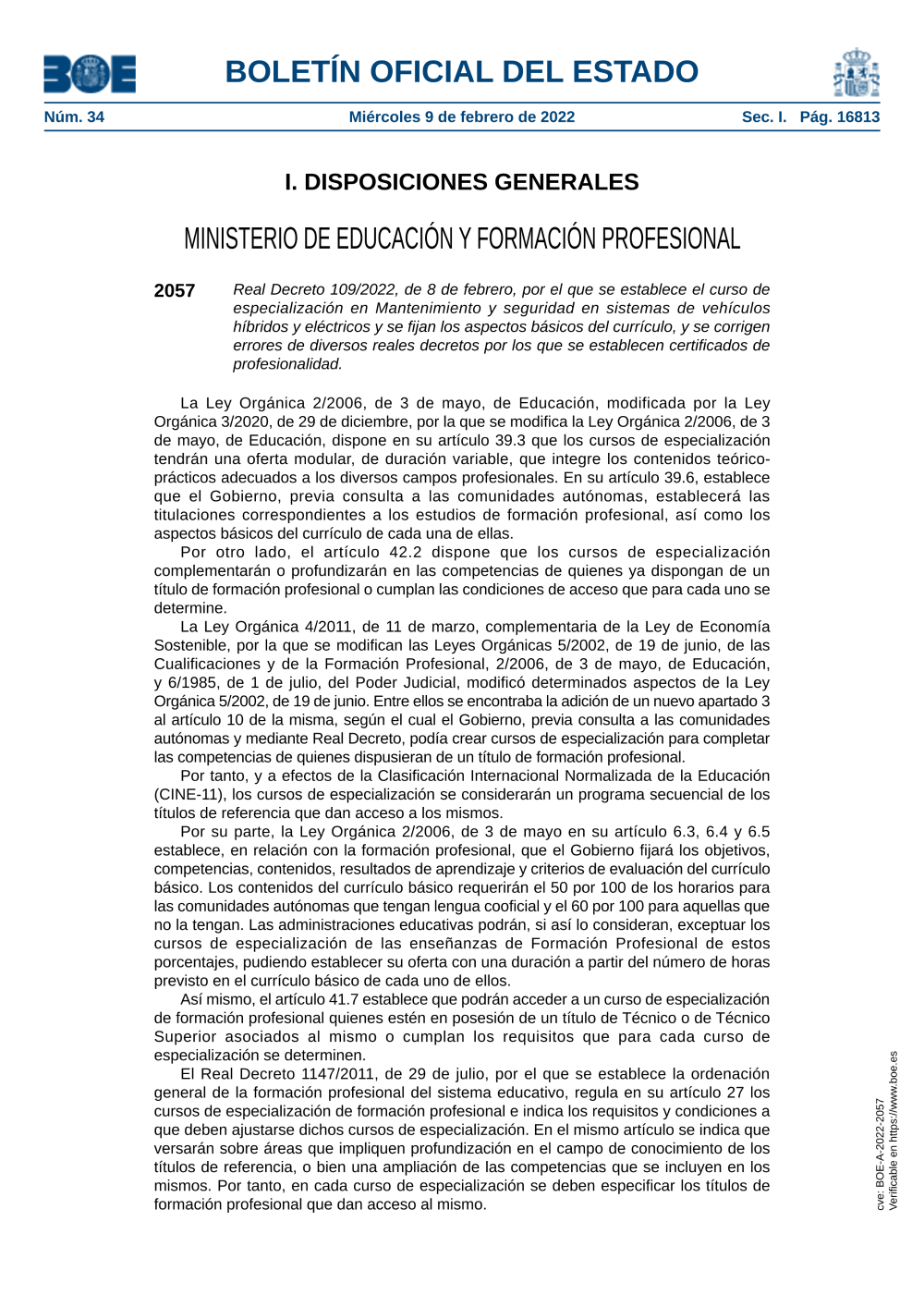 DECRETO 109/2022 de 08/02/2022;MINISTERIO DE EDUCACIÓN Y FORMACIÓN PROFESIONAL;BOE-A-2022-2057;BOE 34 de 2022;2057;09/02/2022