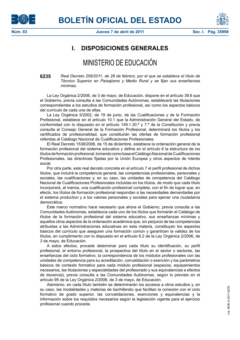 DECRETO 259/2011 de 28/02/2011;MINISTERIO DE EDUCACIÓN;BOE-A-2011-6235;BOE 83 de 2011;6235;07/04/2011