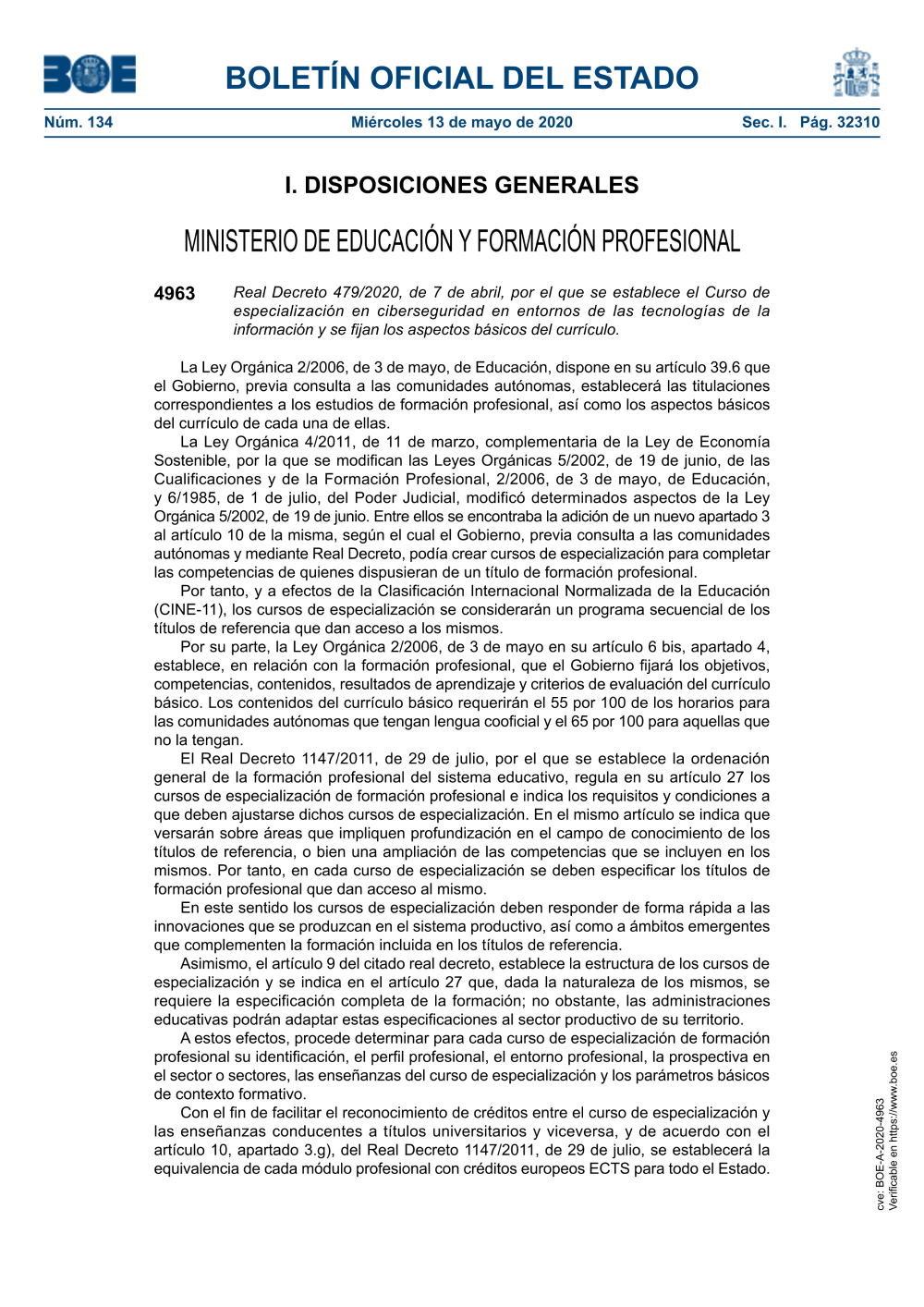 DECRETO 479/2020 de 07/04/2020;MINISTERIO DE EDUCACIÓN Y FORMACIÓN PROFESIONAL;BOE-A-2020-4963;BOE 134 de 2020;4963;13/05/2020