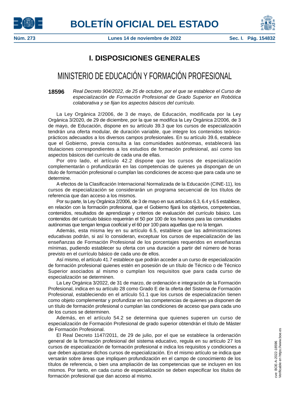 DECRETO 904/2022 de 25/10/2022;MINISTERIO DE EDUCACIÓN Y FORMACIÓN PROFESIONAL;BOE-A-2022-18596;BOE 273 de 2022;18596;14/11/2022
