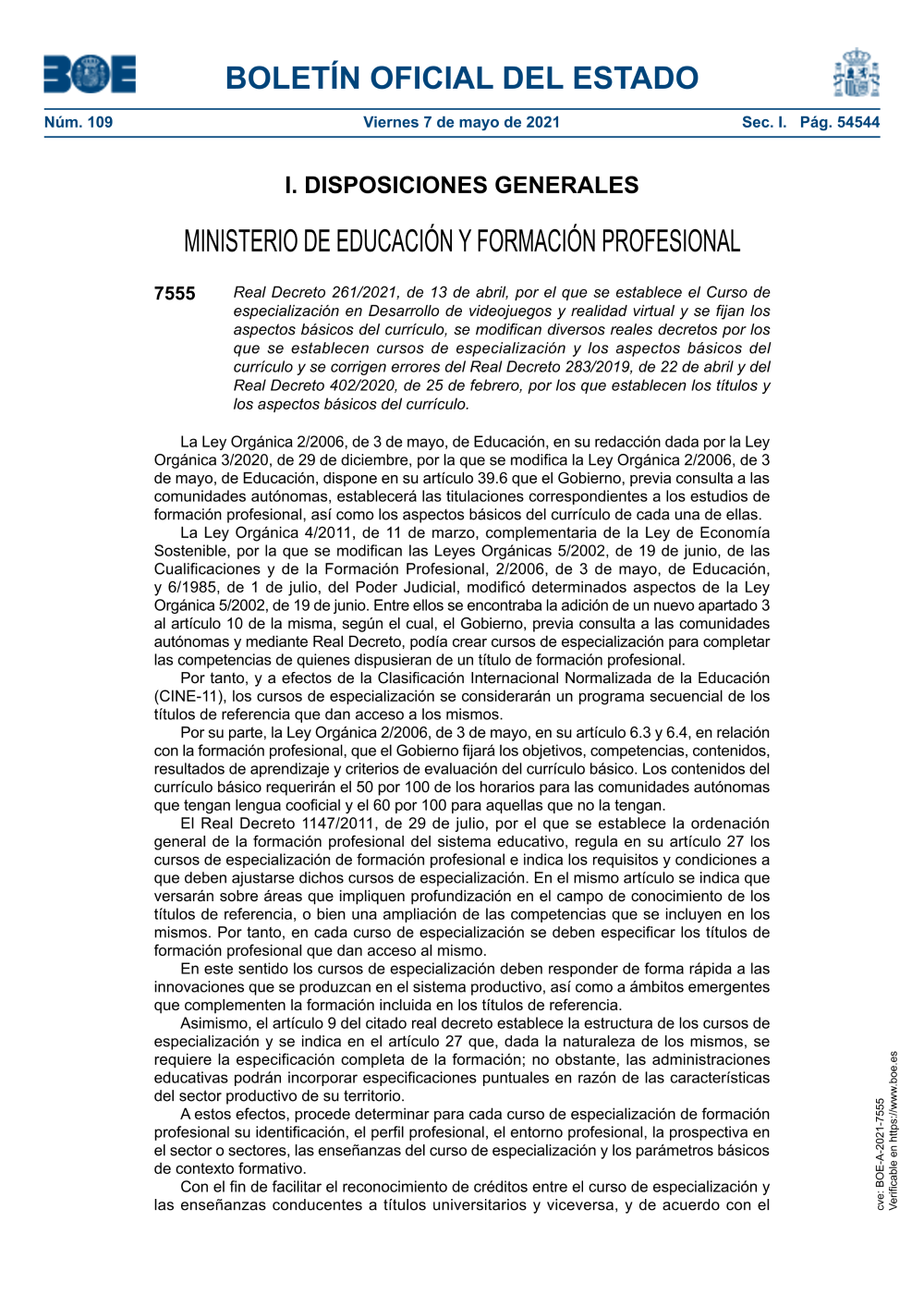 DECRETO 261/2021 de 13/04/2021;MINISTERIO DE EDUCACIÓN Y FORMACIÓN PROFESIONAL;BOE-A-2021-7555;BOE 109 de 2021;7555;07/05/2021