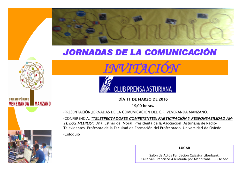 - CP Veneranda Manzano (Oviedo). Jornadas de la comunicación. Conferencia: Telespectadores competentes... Marzo 2016 (pdf)