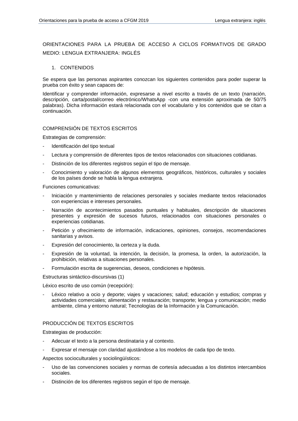 ORIENTACIONES PARA LA PRUEBA DE ACCESO A CICLOS FORMATIVOS DE GRADO MEDIO: LENGUA EXTRANJERA: INGLÉS