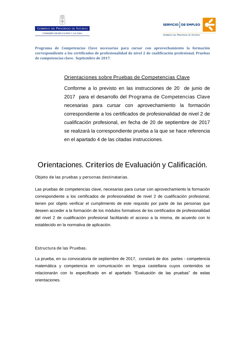 Ortientaciones desarrollo Pruebas Competencias Clave setiembre 2017