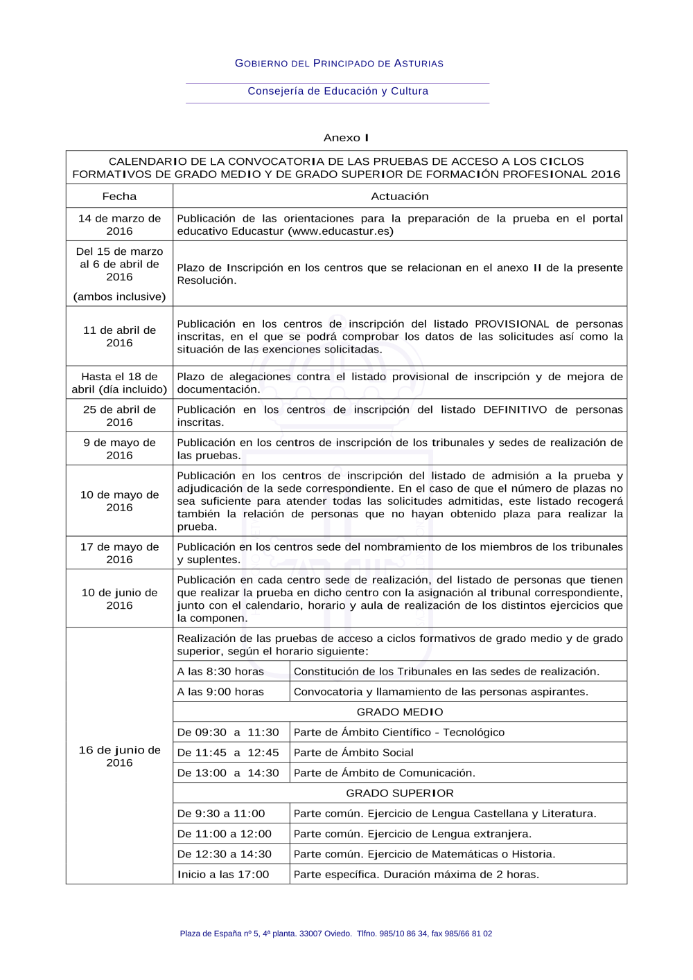 - Pruebas de acceso a ciclos formativos de FP 2016. Calendario, Anexo I (pdf)