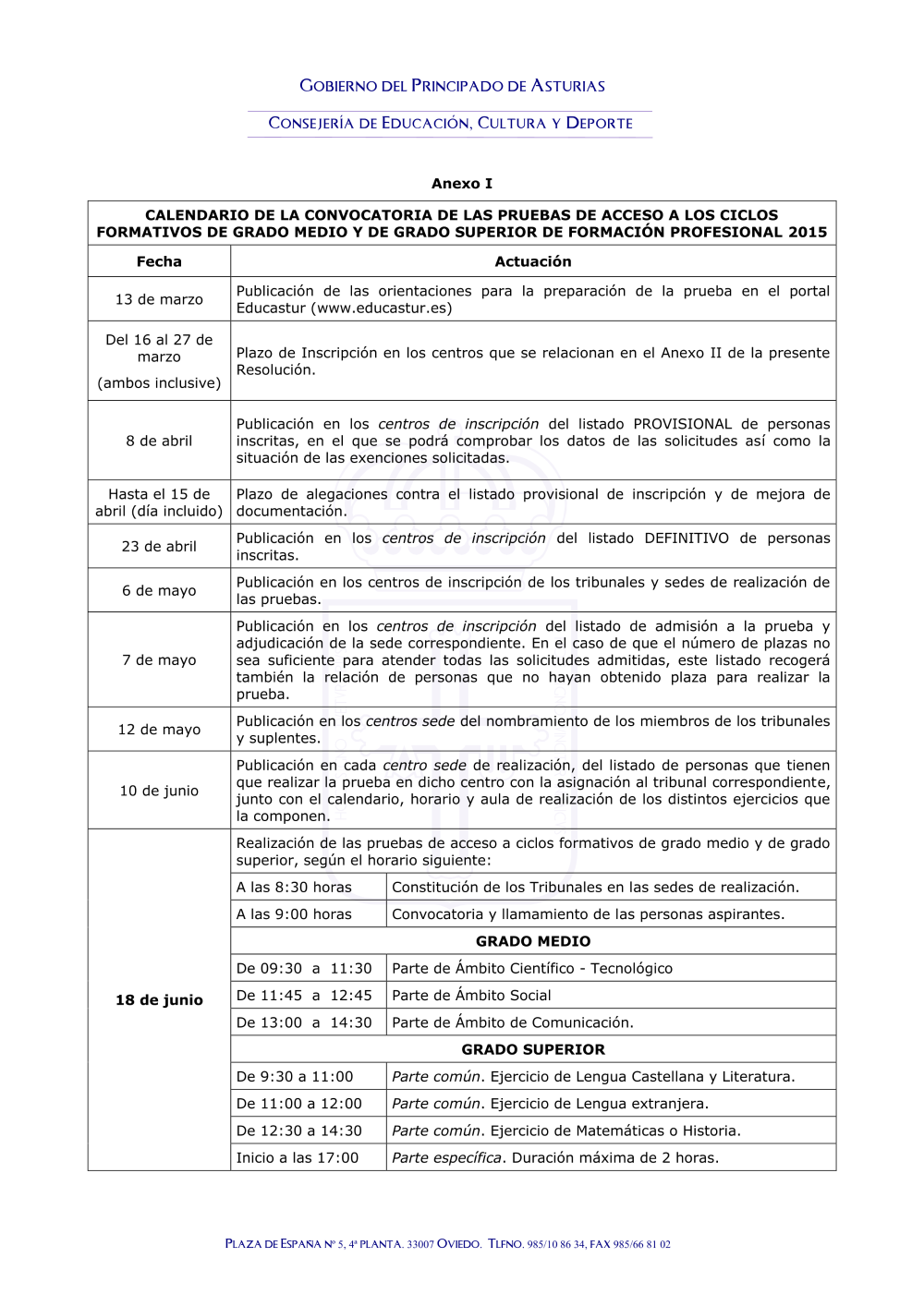 - Anexo I. Calendario pruebas de acceso ciclos