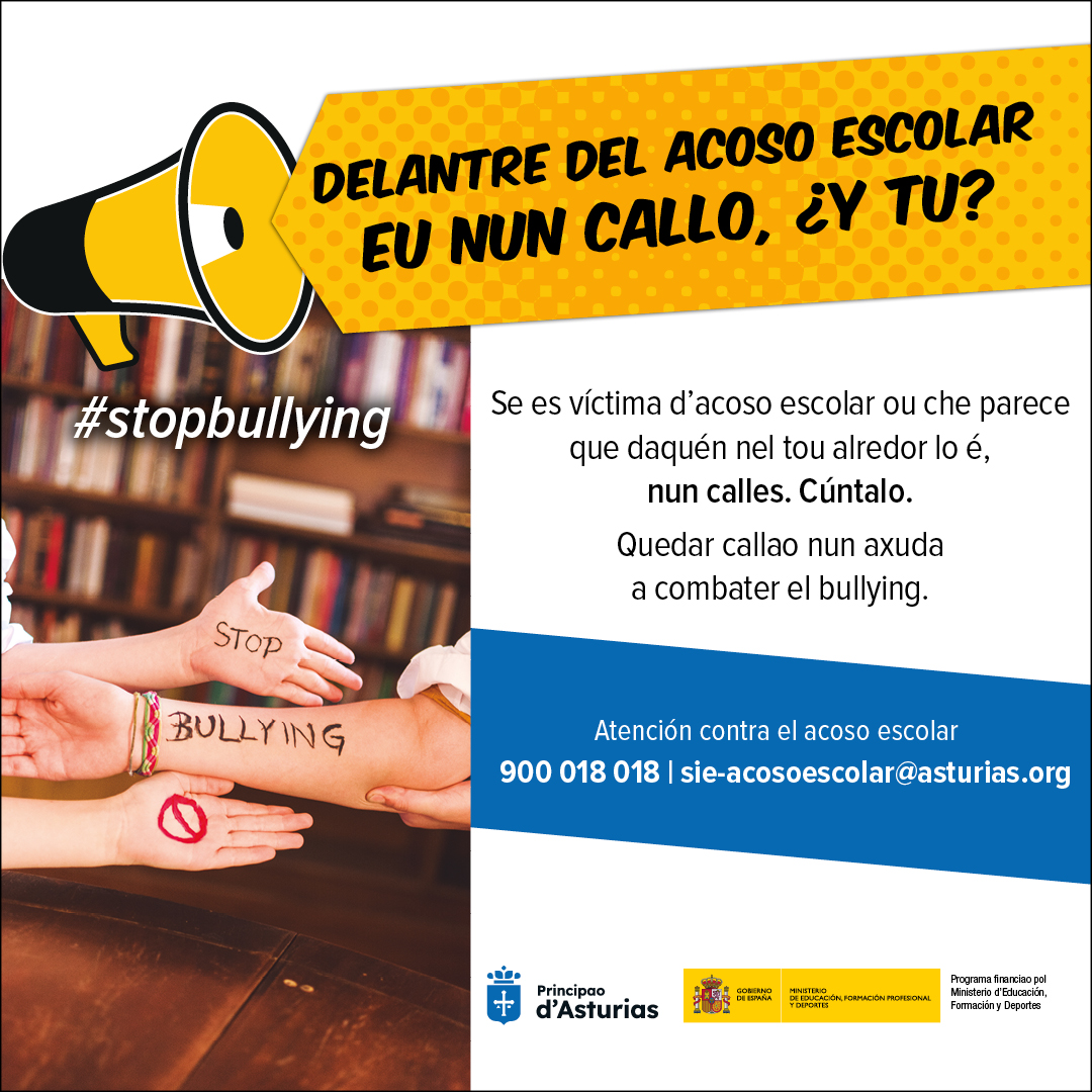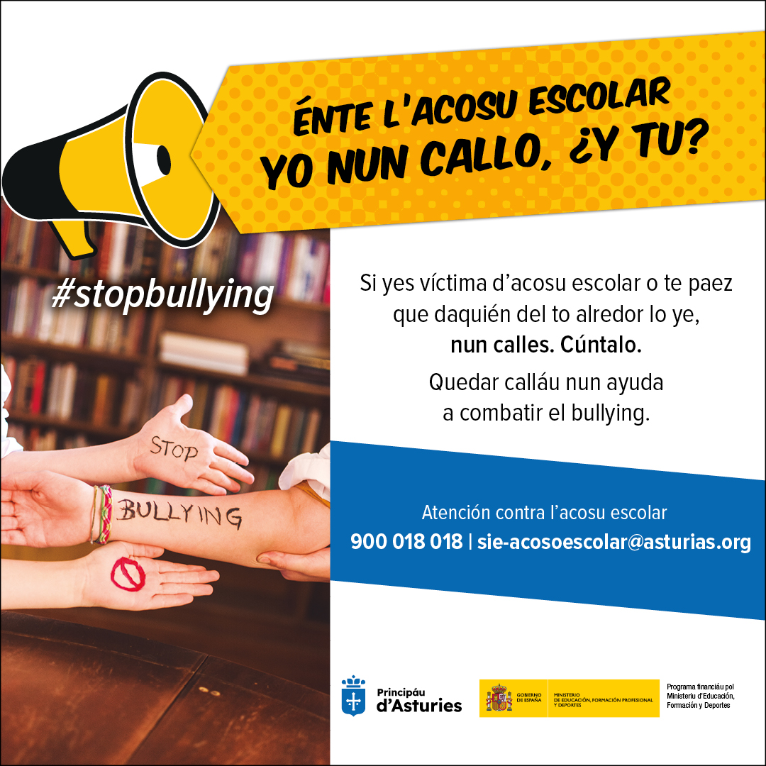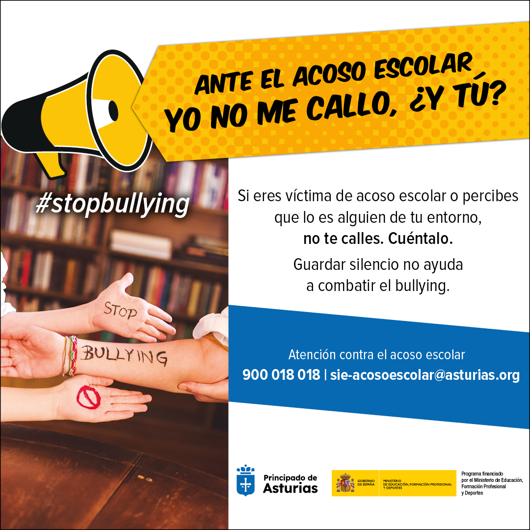 En este marco, el Gobierno del Principado de Asturias, pone en marcha una campaña financiada por el Ministerio de Educación, Formación Profesional y Deportes, cuyo objetivo es concienciar de que el acoso es una conducta grave que debe rechazar toda la sociedad, y que debe ser denunciada no solo por la víctima, sino también por todos aquellos que tengan conocimiento de algún caso.